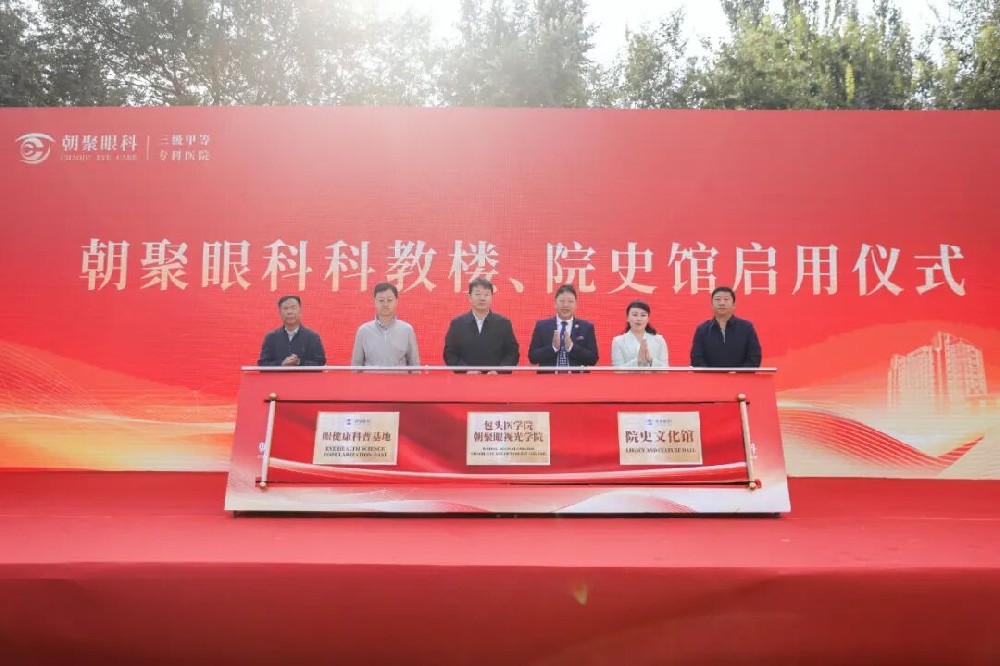 随着卷轴缓缓打开,包头医学院校长崔成立、朝聚眼科董事长张波洲、包头市统战部副部长、市工商联党组书记陈志刚、包头市发展和改革委员会党组书记、主任石钟琴、包头市残疾人联合会党组书记、理事长赵满义、包头市科协副主席郝昀共同见证朝聚眼科科教楼、院史馆正式启用。
