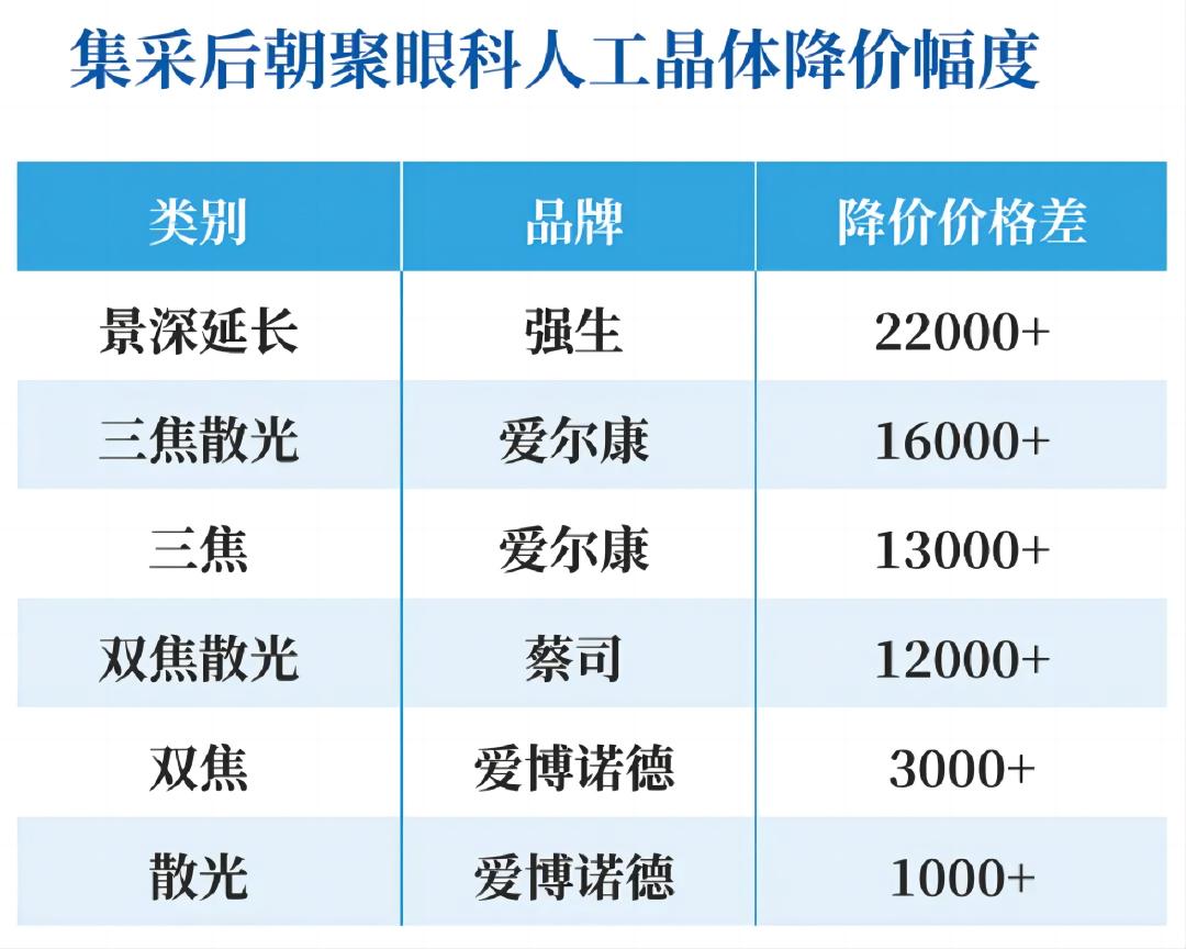 通过集采,部分人工晶体的价格降幅显著。其中,景深延长型人工晶体(强生品牌)的降价幅度超过22000元,三焦散光型人工晶体(爱尔康品牌)降价幅度达16000元以上(根据医院价格)。这使得过去许多患者望而却步的高端晶体,如今变得触手可及。