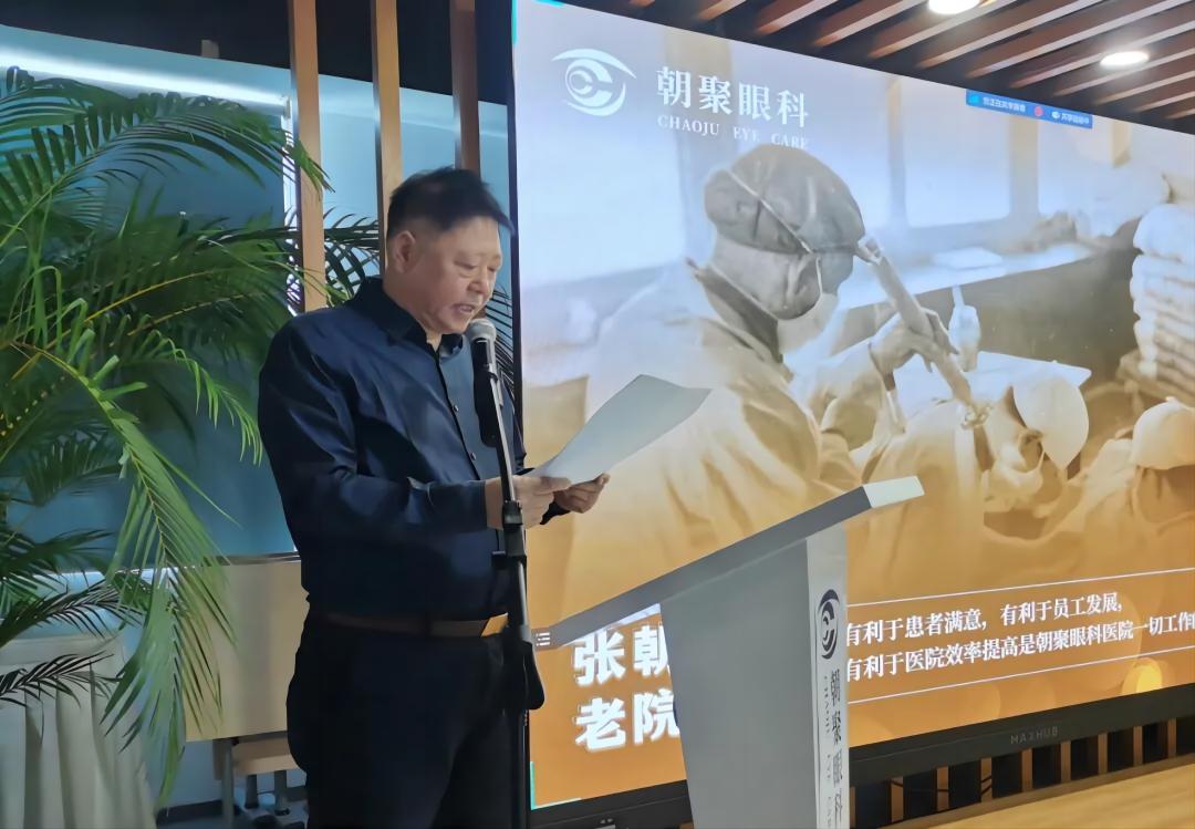 随后,张波洲董事长发表致辞。他回顾了在朝聚眼科创业初期的艰苦环境下,老院长始终以乐观的心态面对困难,始终保持坚定的信念和决心,用真诚和爱心对待患者如亲人,赢得了患者的信任和尊重;讲述了老院长在朝聚眼科发展过程中对员工的悉心培养和用心关爱;概括了朝聚眼科在新时代发展时期取得的优异成绩,分析了面临的机遇和挑战,要求每一位朝聚眼科员工都能以老院长为榜样,戒骄戒躁、谦虚谨慎,始终保持勇往直前、迎难而上的精神风貌;展望未来,希望朝聚人能够继续秉承老院长的遗志和精神,携手努力,以患者为中心,以创新为动力,以效率为驱动,共同打造一个让患者信赖、员工自豪、效率卓越的眼科医疗集团,用实效告慰朝聚先驱!践行心中诺言!追逐百年梦想!
