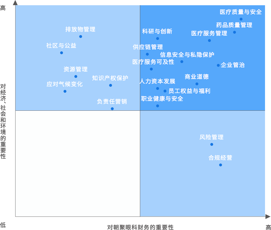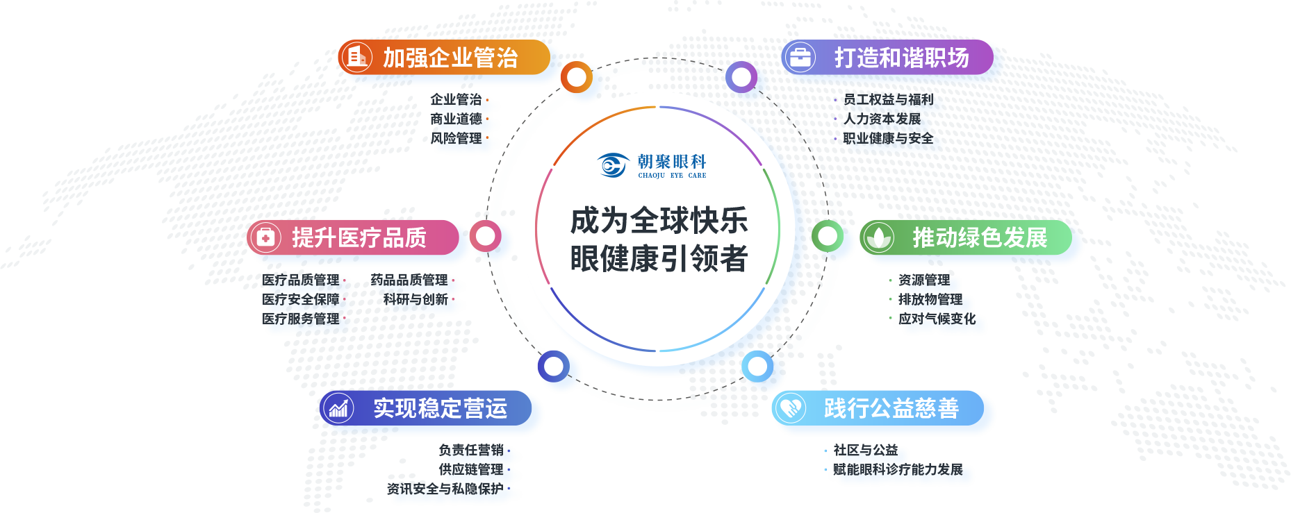 本集团围绕「全球快乐眼健康引领者」的企业愿景,持续聚焦眼科领域的发展与价值增长,并识别出与自身营运发展相关的六大重点领域,制定环境、社会及管治(ESG)策略,推动公司 ESG 管理的落地,保障公司实现高质量发展。